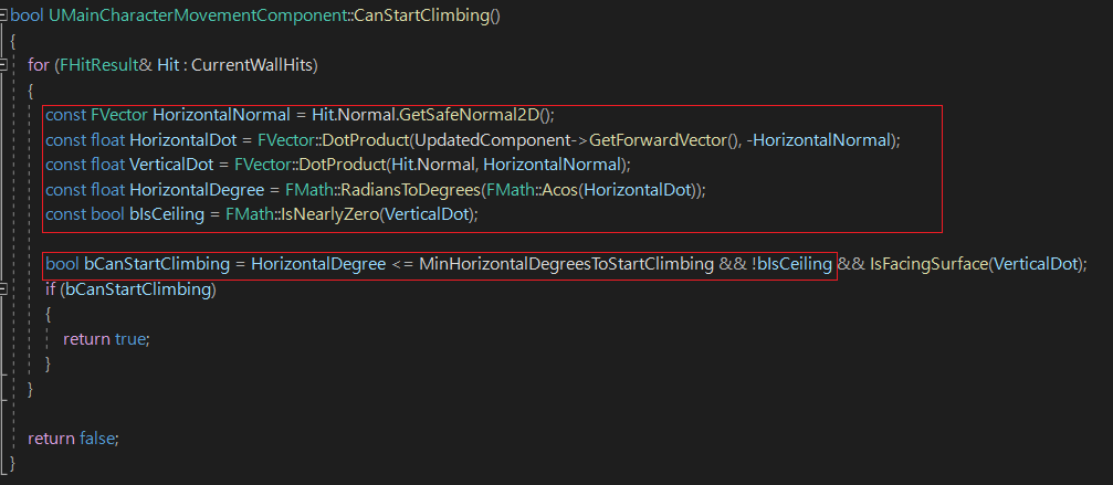 케릭터의 Forward Vector의 좌우 25도 안쪽으로 벽의 Normal Vector가 들어올 때 Climbing 가능하도록 체크한다. 이때 벽의 Normal과 Forward Vector의 단순 내적을 통한 판별을 진행할 경우 벽의 기울기를 제대로 알기 어려워진다. 따라서 Forward Vector의 좌우 25도 안쪽으로 들어오는 값인지에 대한 검사와 벽이 얼마만큼의 기울기를 가지고 있는지에 대한 검사를 분리한다.