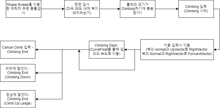 구현 코드 위치: UMainCharacterMovementComponent, UMainCharacterAnimInstance, AMainCharacter, AMainCharacterPlayerController 네 개의 클래스에 Climbing관련 구현 코드가 모두 존재