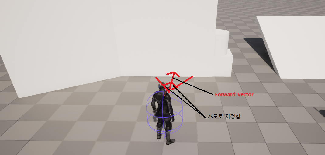 * 케릭터의 Forward Vector와 좌우 25도의 범위