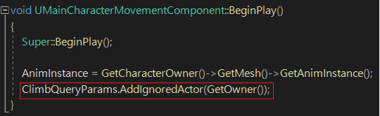 * 자기자신은 충돌검사에서 제외하기 위해서 멤버변수로 선언된 FCollisionQueryParams ClimbQueryParams에 자기자신을 삽입한다.