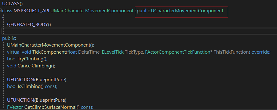* 완성된 클래스를 기준으로 스크린샷을 찍어 이미 함수들이 존재하는 상태이나 UCharacterMovementComponent를 상속받아서 생성했다는 점을 확인하기 위한 스크린샷