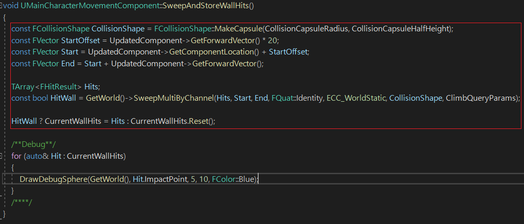 const bool HitWall = GetWorld()->SweepMultiByChannel(Hits, Start, End, FQuat::Identity, ECC_WorldStatic, CollisionShape, ClimbQueryParams);