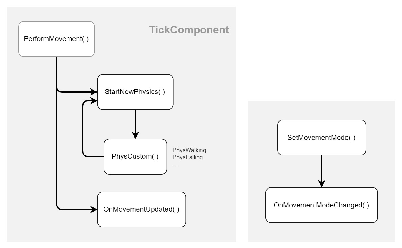 - StartNewPhysics : 현재 이동모드에 따라서 Phys함수를 선택. 이동모드는 SetMovementMode를 통해 enum값으로 제어됨. 예를 들어 현재 걷기 모드인 경우 StartNewPhysics는 걷기에 알맞은 물리학을 처리하는 PhysWalking을 호출.