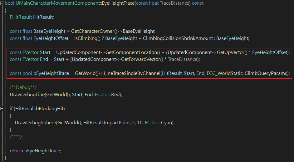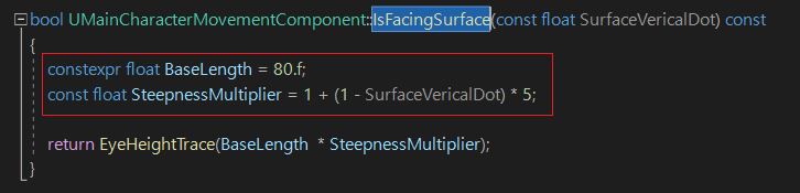 * BaseLength는 말그대로 기본적인 Line Trace의 거리이며 여기에 SteepnessMultiplier의 크기에 따라 거리값이 달라질 것인데 공식을 보면 1 + (1 - SurfaceVerticalDot) * 5이다 곱하는 5는 큰 의미를 부여할 것 없이 적절한 수치를 주었다고 보면 되는 것이고 SurfaceVerticalDot의 값에 앞서 설명한 Cos(-90) ~ Cos(90)의 값이 들어간다고 보면 될 것. 그렇게 구한 길이값을 통해 EyeHeightTrace를 진행한다.