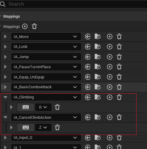 *Input Mapping Context에 설정되어 있는 Climbing과 CancelClimbing. 각 입력에서 호출되는 함수에서는 Climbing을 하고자 하는 상태값인 bool 값을 변경해준다.