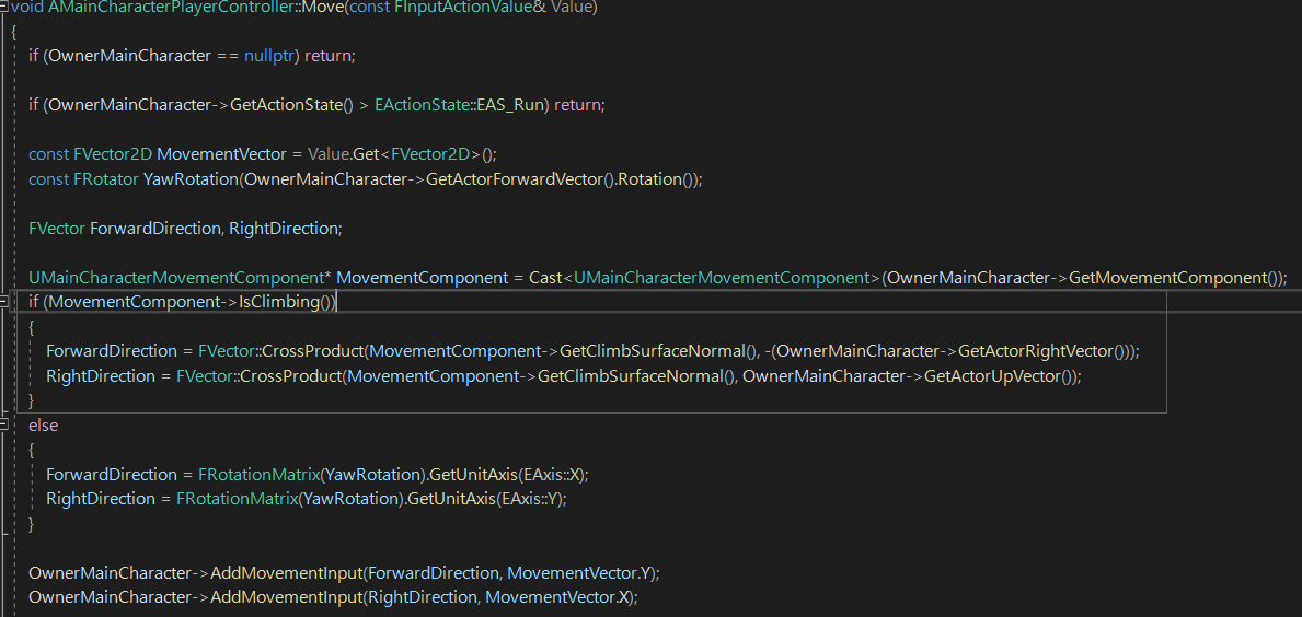 - ForwardDirection = FVector::CrossProduct(MovementComponent->GetClimbSurfaceNormal(), -(OwnerMainCharacter->GetActorRightVector()));