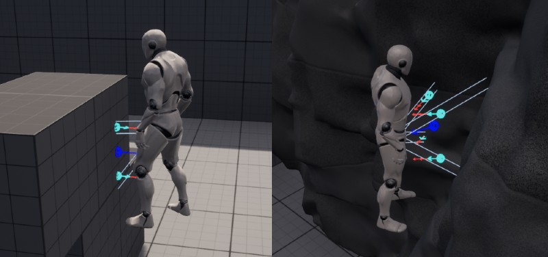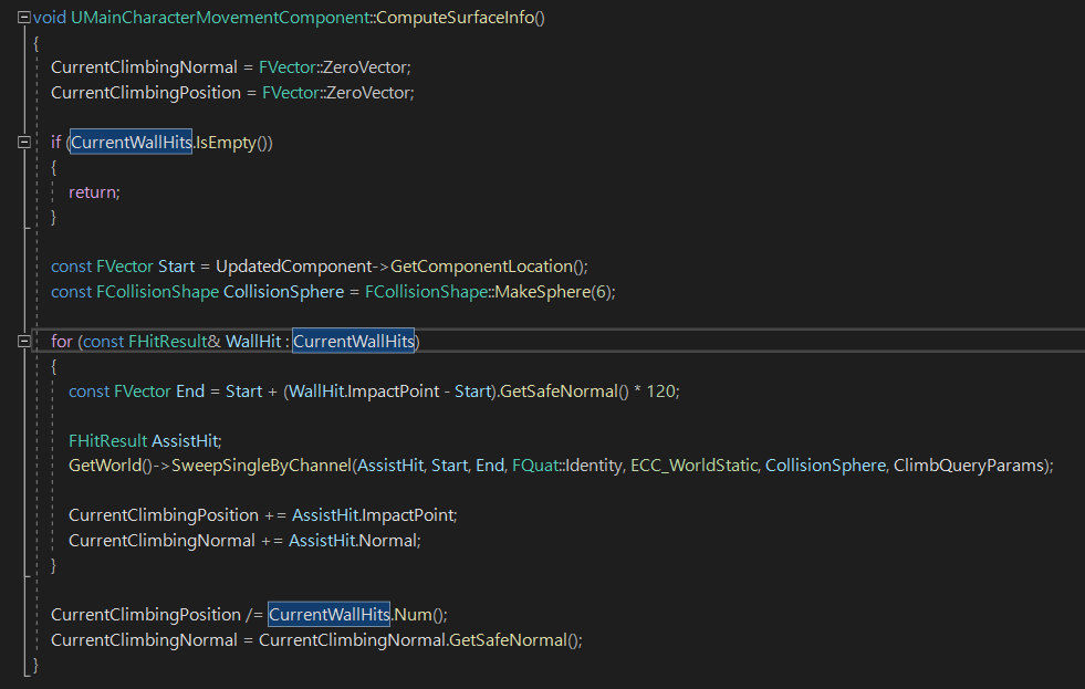 - 기본적인 원리는 CurrentClimbingPosition과 CurrentClimbingNormal을 SweepAndStoreWallHits에서 구한 CurrentWallHits값들의 총합을 갯수로 나누는 평균값으로 계산을 해내는 것이다. 다만 그 과정에서 수행한 SweepMultiByChannel이 케릭터의 Location과 Forward 벡터를 통해 Start와 End를 지정하여 정확도가 떨어진다는 단점이 존재한다.