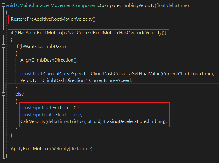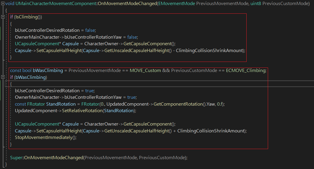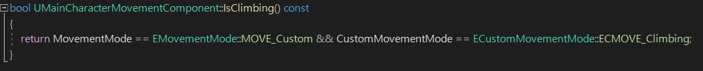 - const bool bWasClimbing = PreviousMovementMode == MOVE_Custom && PreviousCustomMode == ECMOVE_Climbing;