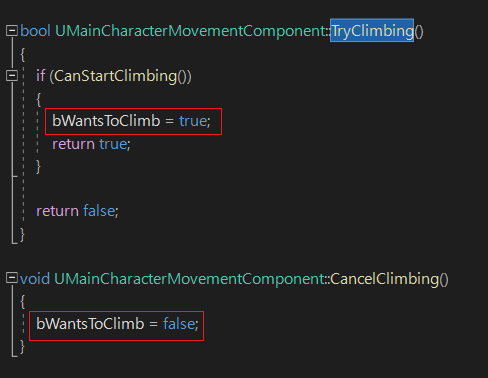 등반을 시작하고 중지하기 위해 TryClimbing 및 CancelClimbing의 두 함수와 함께 플레이어의 의도를 저장하는 부울 bWantsToClimb를 만든다. bWantsToClimb이 true인지 확인하여 OnMovementUpdated의 코드를 대체할 수도 있다.