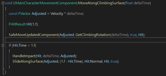 - ComputeClimbingVelocity함수에서는 속도는 계산했지만 실제로 이동이 일어나지는 않았다. MoveAlongClimbingSurface는 실제로 속도에 따라서 케릭터를 표면의 어느 위치로 이동시킨다. ComputeClimbingVelocity에서 계산된 속도에 deltaTime을 곱해주어서 시간에따른 이동량을 계산하고 SafeMoveUpdatedComponent를 통해 이동시킨다.