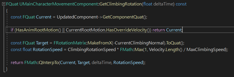 - 클라이밍 동작에 대한 회전은 캐릭터가 벽의 법선과 반대 방향을 바라보도록 만들 수 있다. 이를 코드로 구현하기 위해, -CurrentClimbingNormal과 같은 X 축(앞쪽 방향)을 가진 회전 행렬을 생성할 수 있다. 그러나 즉각적인 회전 변경은 부드럽지 않을 수 있다. 대신, 현재 회전에서 목표 회전까지 보간을 진행하여 ClimbingRotationSpeed가 속도를 제어하도록 한다.