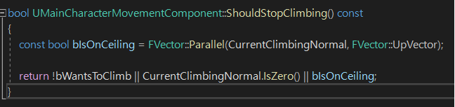 - bIsOnCeiling은 지금 오르고자 하는 벽의 노말을 계산하여 천장인지 확인하는 것이도 bWantsToClimb은 입력으로 등반을 취소하는 경우이다. CurrentClimbingNormal.IsZero()는 타려고 하는 벽이 없어지는 경우이므로 셋 중 하나라도 True일 경우 등반을 중지하도록 true값을 반환한다.