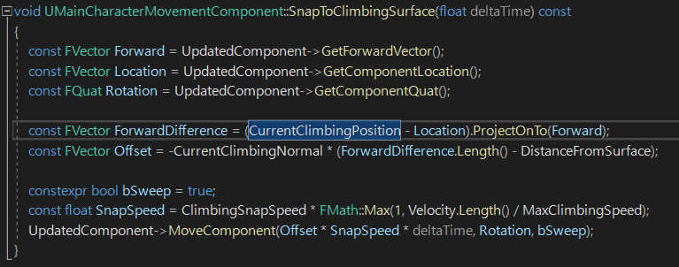 - const FVector ForwardDifference = (CurrentClimbingPosition - Location).ProjectOnTo(Forward);