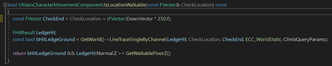 const bool bHitLedgeGround = GetWorld()->LineTraceSingleByChannel(LedgeHit, CheckLocation, CheckEnd, ECC_WorldStatic, ClimbQueryParams);