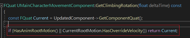 - 앞에서 Climbing의 경우 이동을 위해서 Rotation을 수정하여 사용했는데 RootMotion이 실행 중이라면 Rotation을 수정하지 않고 RootMotion의 Rotation을 따라야하므로 해당 코드를 삽입한다