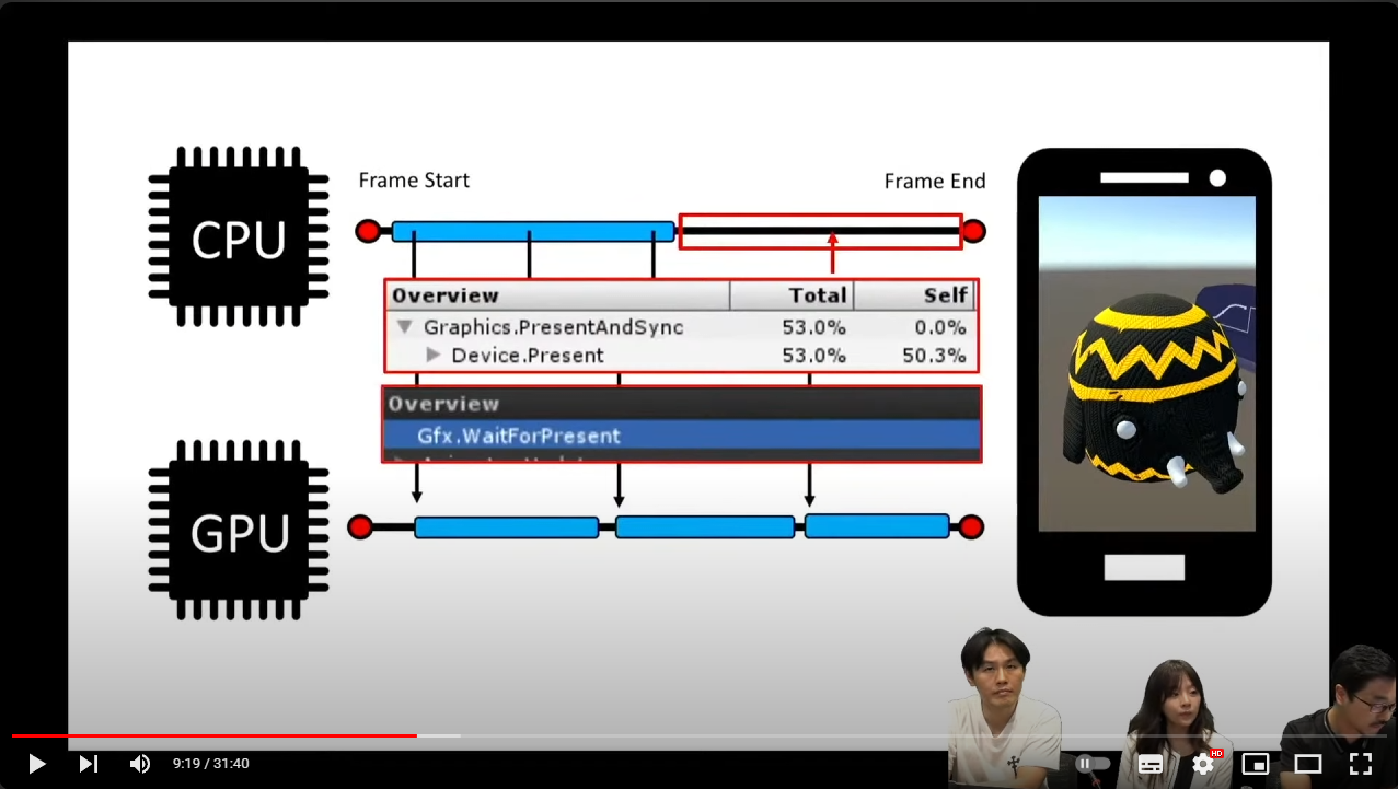 렌더링에서 CPU와 GPU 모두는 프레임을 렌더링하기 위해 각자 맡은 작업을 완료해야한다. 이러한 작업 중 하나라도 완료에 오랜시간이 걸리게 되면, 프레임 렌더링에 지연이 발생할 수 있다.