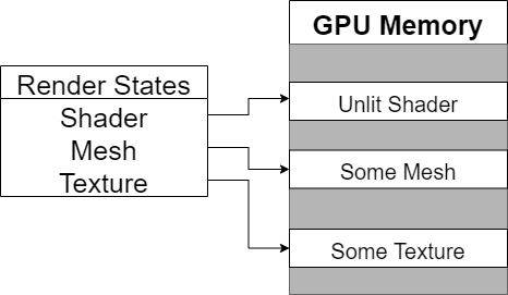 오브젝트를 렌더링하기 시작하면 GPU에 어떤 텍스처를 사용 할지, 어떤 버텍스들을 사용 할지, 어떤 쉐이더를 사용 할지등을 순차적으로 알려줘야 한다. 이런 정보들은 GPU의 상태 정보를 담는 테이블에 저장된다. 이 테이블을 렌더 상태(Render States)라고 부르며 각각의 요소는 GPU 메모리를 가리키는 포인터를 저장한다.