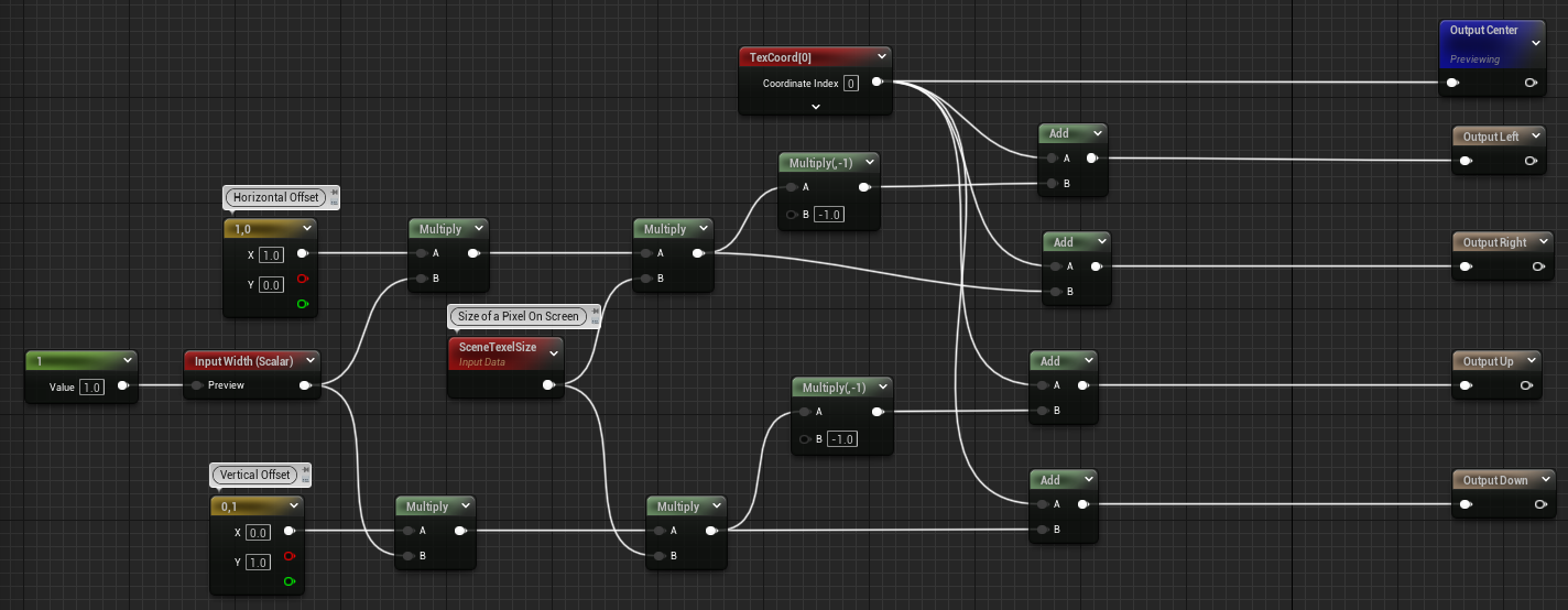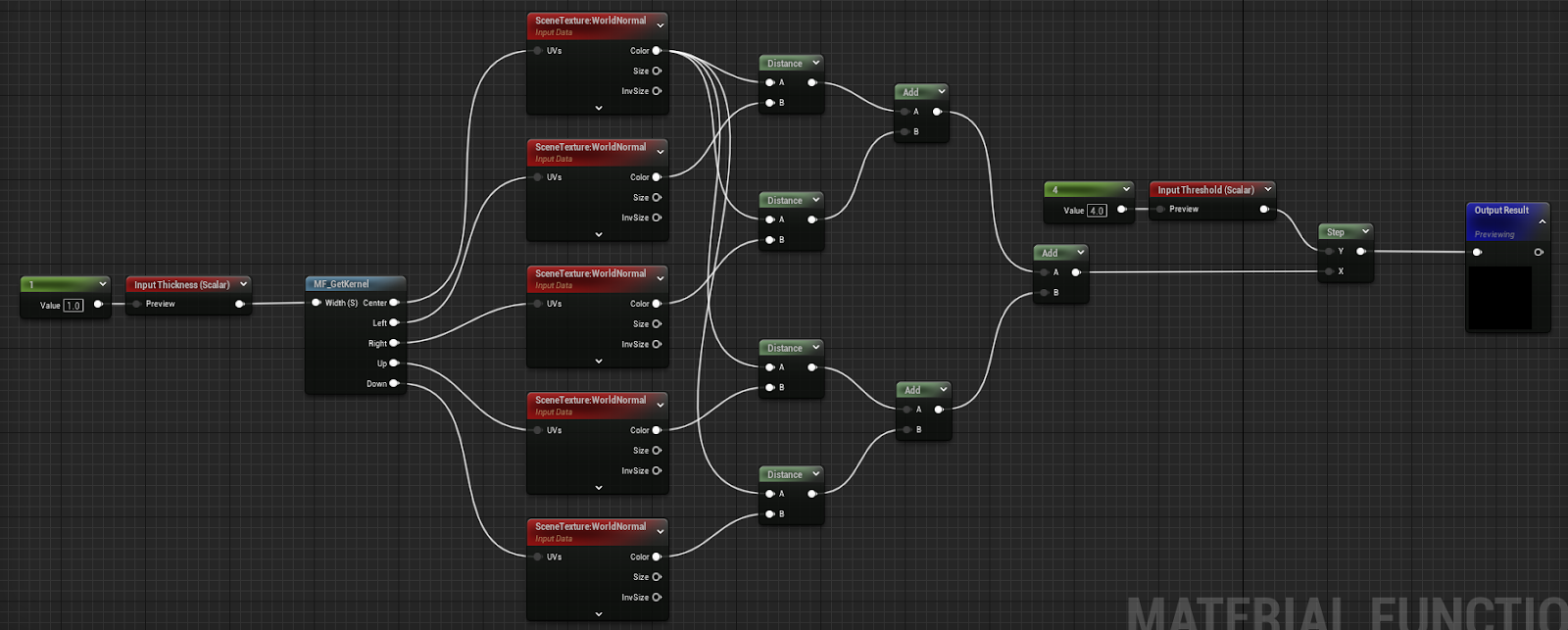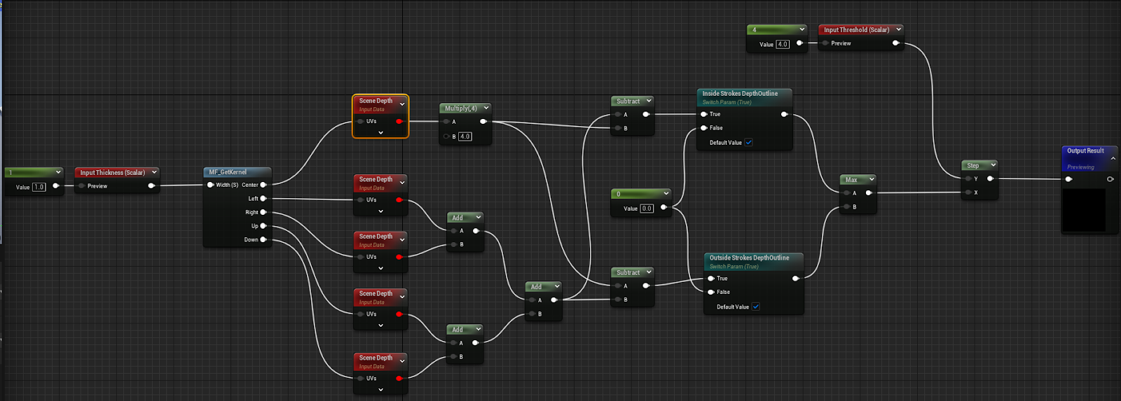 앞에서 설명한 원리대로 상하좌우 픽셀의 깊이값의 합과 타겟픽셀의 깊이값 * 4값을 비교하여 결과를 리턴하는 함수. 중간에 Switchparameter 노드는 이 함수에서 연산한 값을 적용할지 말지 선택할 수 있는 선택지를 주는 노드로써 연산과는 관련이 없다.