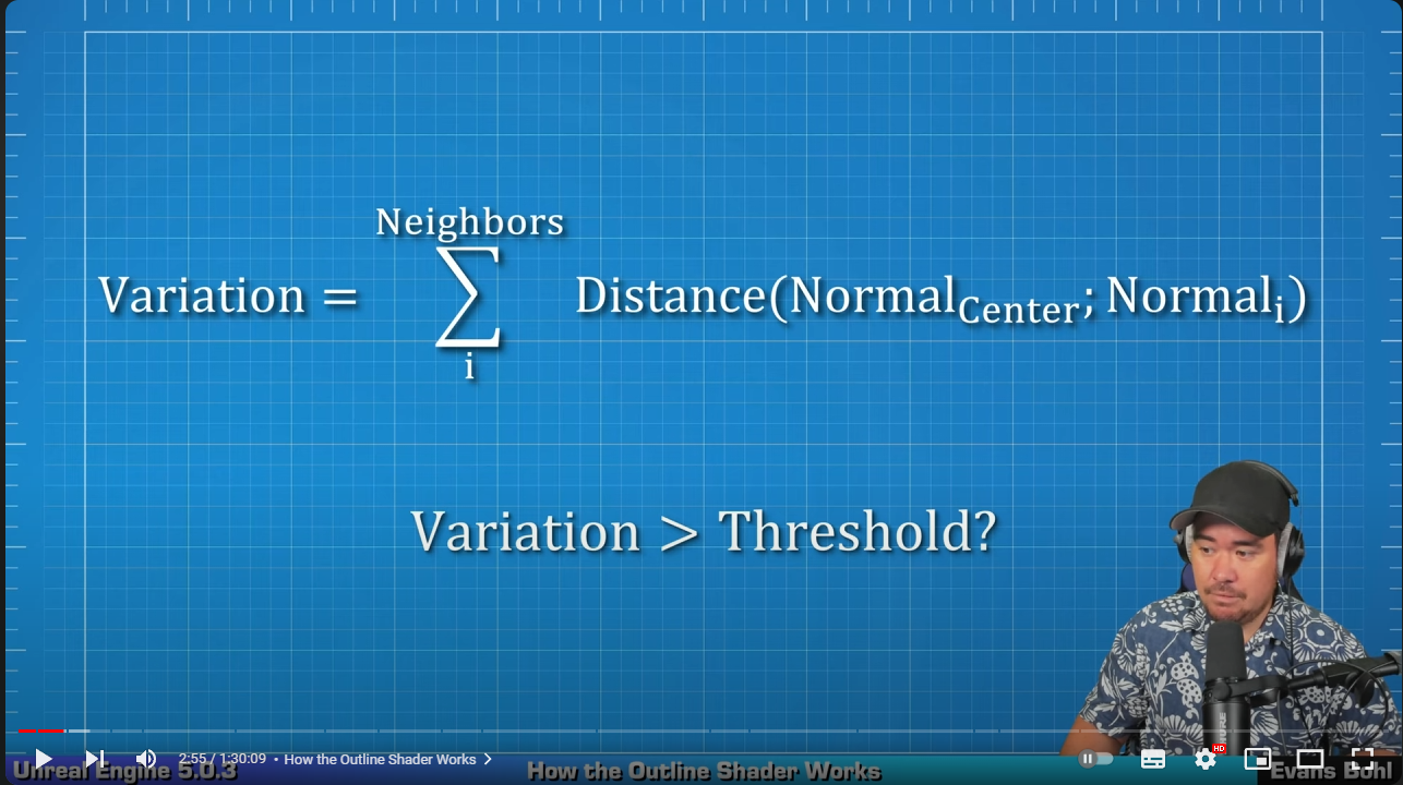 앞에서처럼 타겟 픽셀의 왼쪽, 오른쪽, 위, 아래의 픽셀 노말과 타겟 픽셀 노말의 거리를 각자 구해 모두를 더하면 Variation을 구할 수 있는데 여기서도 해당 Variation값이 한계치(Threashold)를 넘으면 모서리가 되므로 검은색으로 칠해준다.
