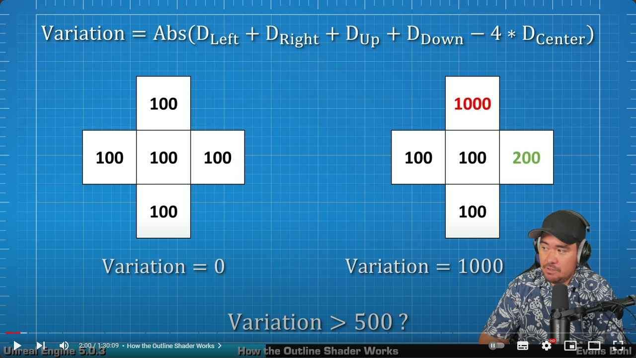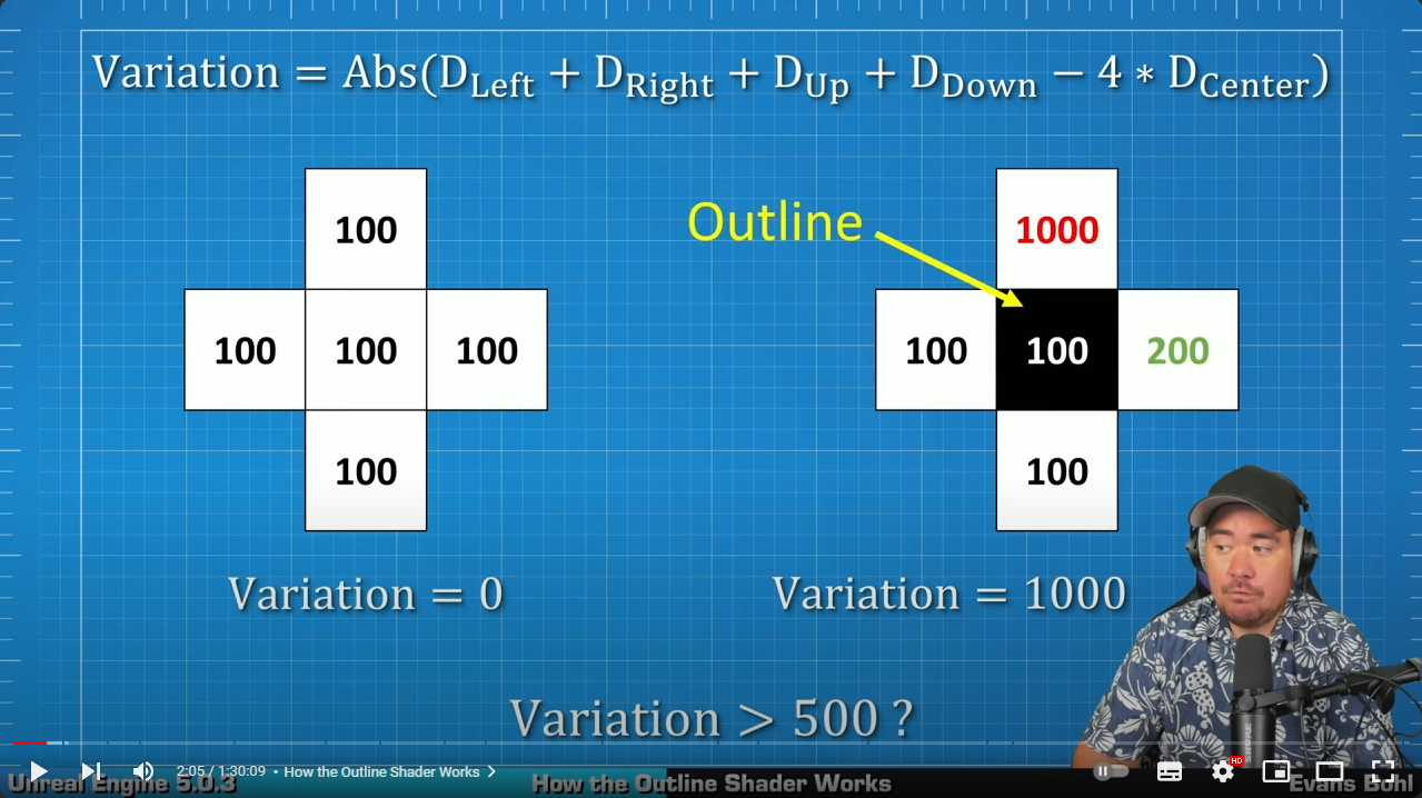 앞에서 설명한 원리대로 상하좌우 픽셀의 깊이값의 합과 타겟픽셀의 깊이값 * 4값을 비교하여 결과를 리턴하는 함수. 중간에 Switchparameter 노드는 이 함수에서 연산한 값을 적용할지 말지 선택할 수 있는 선택지를 주는 노드로써 연산과는 관련이 없다.