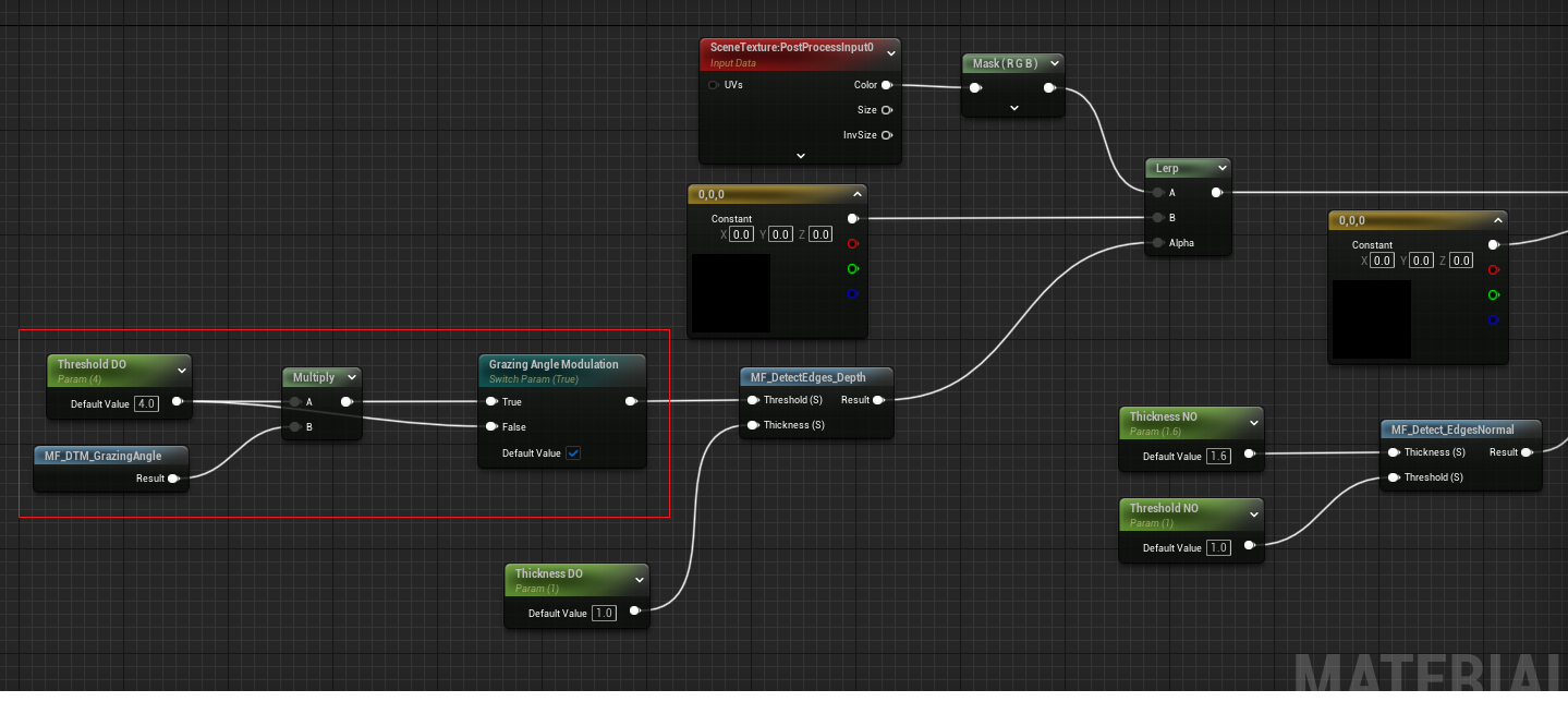 해당 공식을 적용해서 생성한 MF_ThicknessModulation함수를 PostProcess용 Material에 아래와 같이 적용한다.