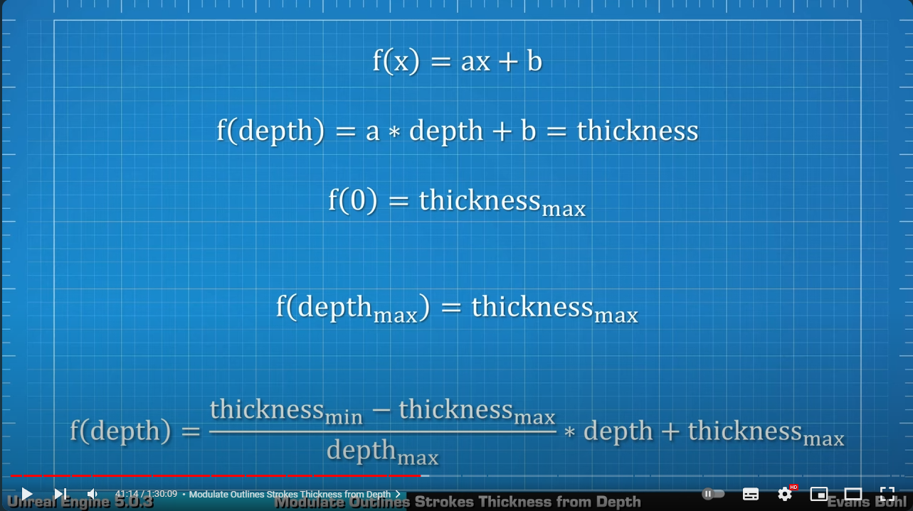 주어진 깊이에 대해 해당 두께를 출력하는 a * x + b 형태의 음의 선형 함수를 찾기 위해, 우리는 두께가 카메라에 가까울 때, 즉 깊이가 0일 때 최대 값과 같아야 하며, 또한 카메라와의 최대 거리에서 최소 값과 같아야 한다는 것을 알고 있기 때문에 방정식을 풀어 이 음의 선형 함수를 이용한다. 이 함수를 아웃라인 쉐이더에서 사용할 수 있다.