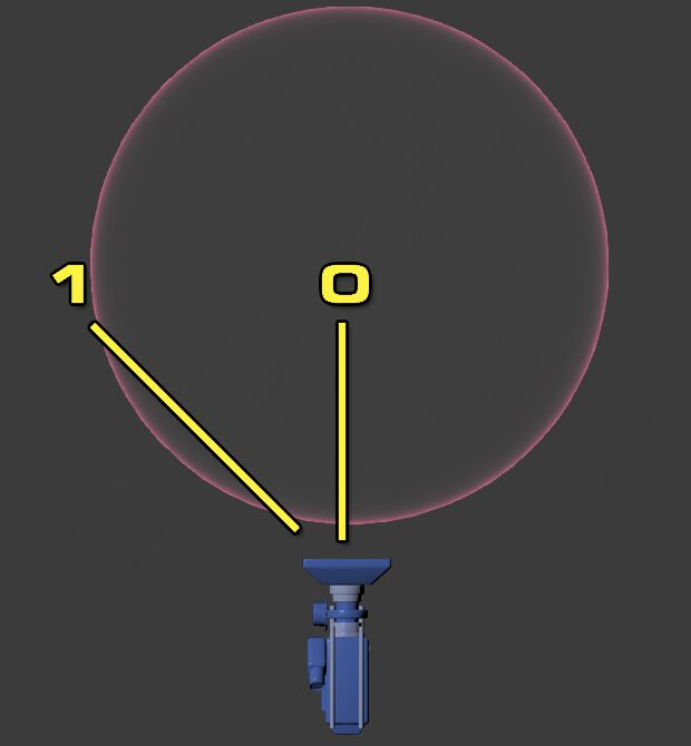 UE4 에서 Fresnel 머티리얼 표현식 노드는 표면 노멀과 카메라까지의 방향의 내적을 기반으로 감쇠 계산을 합니다. 표면 노멀이 카메라를 바로 향하면 출력값은 0, 즉 발생하는 프레넬 이펙트가 없습니다. 표면 노멀이 카메라에 수직인 경우 출력값은 1, 즉 최대치의 프레넬 이펙트가 발생합니다. 그런 다음 그 결과를 [0,1] 범위로 제한시켜 가운데 음수 컬러가 생기지 않도록 합니다. 다음 그림은 이 개념을 나타냅니다.