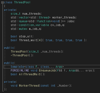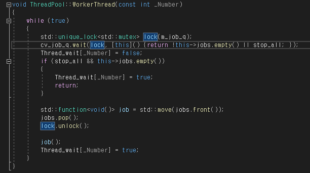 WorkerThread내부에서 std::mutex를 이용한 std::unique_lock을 생성하고 cv_job_q 조건변수에 넘겨주며 wait한다. wait시에 작성된 람다함수가 true를 반환할 때만 que에서 job을 꺼내어 실행시키며 unlock한다.