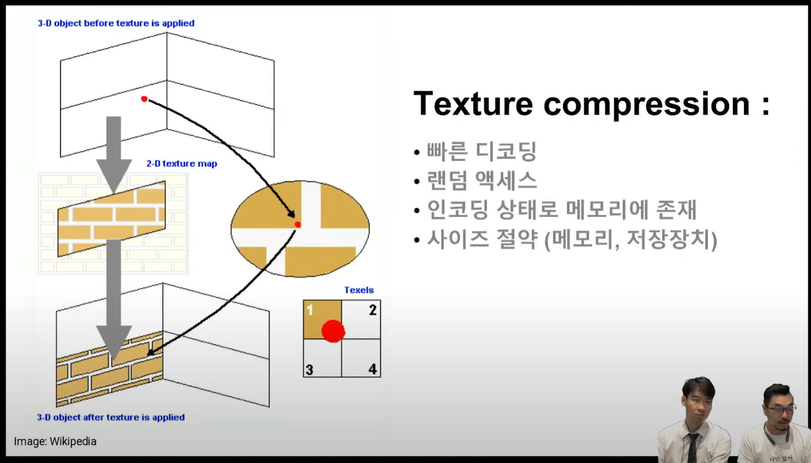 - 사이즈 절약(메모리, 저장장치): 압축된 형태의 텍스쳐는 사이즈 절약이 가능해야한다.