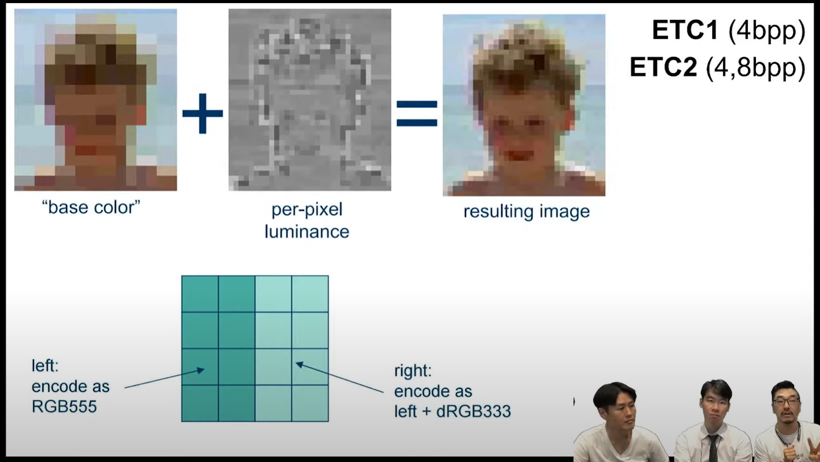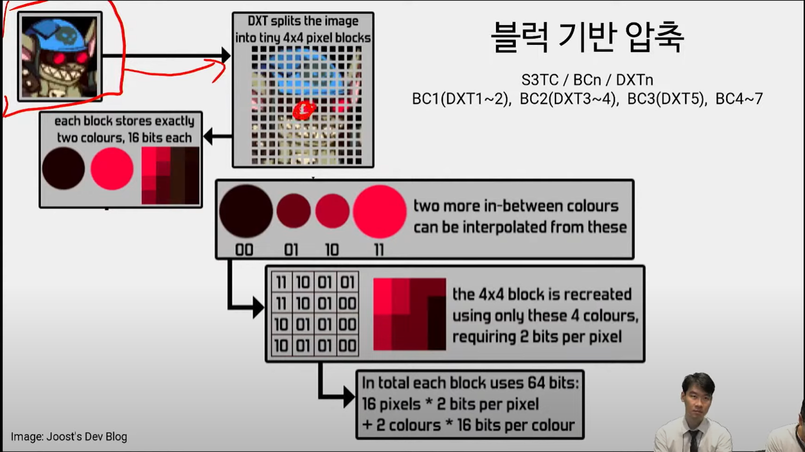- 이 비트 정보는 텍스처에서 해당 픽셀의 색상을 복원하는 데 사용됩니다.