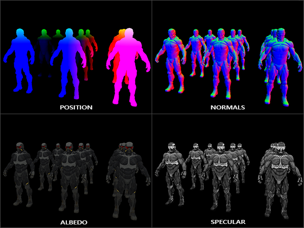 GBuffer에 값을 저장하기 위해서는 GPU가 MRT(Multiple Render Target)기능을 하드웨어적으로 지원해야하며 그래픽스 API또한 이 기능을 지원해야 한다(DirectX 9.0이상)