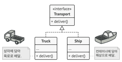 예를 들어 Truck 과 Ship 클래스들은 모두 Transport 인터페이스를 구현해야 하며, 이 인터페이스는 deliver(배달)라는 메서드를 선언합니다. 그러나 각 클래스는 이 메서드를 다르게 구현합니다. 트럭은 육로로 화물을 배달하고 선박은 해상으로 화물을 배달합니다. RoadLogistics(도로 물류) 클래스에 포함된 팩토리 메서드는 Truck 객체들을 반환하는 반면 SeaLogistics(해운 물류) 클래스에 포함된 팩토리 메서드는 선박 객체들을 반환합니다.
