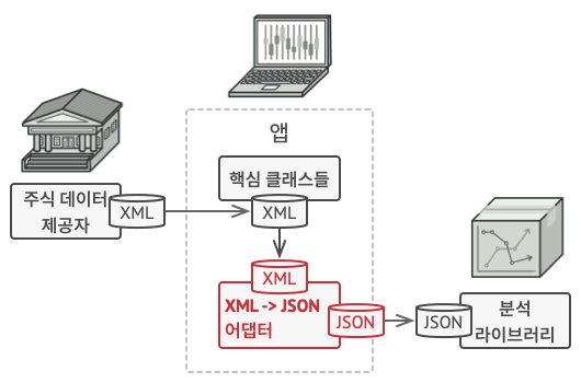 다시 당신의 주식 시장 앱을 살펴봅시다. 당신은 형식이 호환되지 않는 문제를 해결하기 위해 당신의 코드와 직접 작동하는 분석 라이브러리의 모든 클래스에 대한 XML->JSON 변환 어댑터를 만듭니다. 그 후 이러한 어댑터들을 통해서만 해당 라이브러리와 통신하도록 코드를 조정합니다. 어댑터는 호출을 받으면 들어오는 XML 데이터를 JSON 구조로 변환한 후 해당 호출을 래핑된 분석 객체의 적절한 메서드들에 전달합니다.