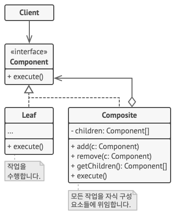 복합체 패턴은 객체 트리의 모든 컴포넌트들에 대해 재귀적으로 행동을 실행할 수 있도록 합니다.
