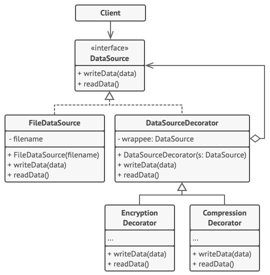 이 애플리케이션은 데이터 소스 객체를 한 쌍의 데코레이터로 래핑합니다. 두 래퍼 모두 디스크에 데이터를 쓰고 읽는 방식들을 변경합니다.
