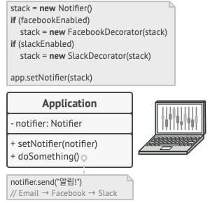 클라이언트 코드는 기초 알림자 객체를 클라이언트의 요구사항들과 일치하는 데코레이터들의 집합으로 래핑해야 합니다. 위 결과 객체들은 스택으로 구성됩니다.