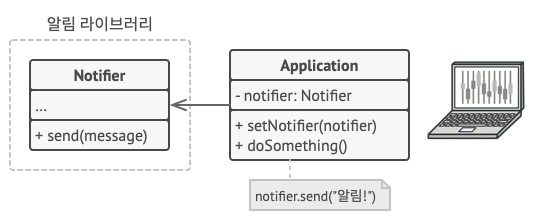 이 라이브러리의 초기 버전은 Notifier(알림자) 클래스를 기반으로 했으며, 이 클래스에는 몇 개의 필드들, 하나의 생성자 그리고 단일 send(전송) 메서드만 있었습니다. 이 메서드는 클라이언트로부터 메시지 인수를 받은 후 그 메세지를 알림자의 생성자를 통해 알림자에게 전달된 이메일 목록으로 보낼 수 있습니다. 또 클라이언트 역할을 한 타사 앱은 알림자 객체를 한번 생성하고 설정한 후 중요한 일이 발생할 때마다 사용하게 되어 있었습니다.
